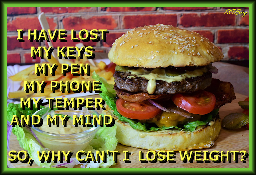 Exceptional Loss Image May 5, 2023 R.E. Berg Culinary Curiosities, Fantasy Fitness, humor, joke, meme hamburger, lose, mind, pen, phone, temper, weight