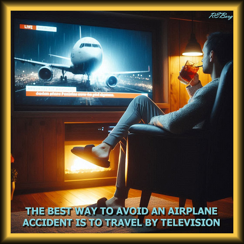 Safety Tip Image September 18, 2025 R.E. Berg Age Management, humor, joke, Locational Logic, meme, Random Observations, Travel Trauma airplane accident, avoid, best way, by television, fireplace, man, sipping drink, slippers, travel