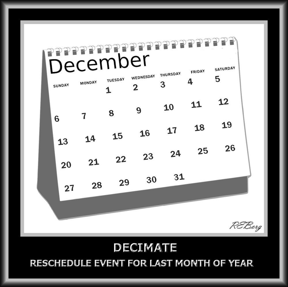 Deviant Definition – Decimate Image July 9, 2024 R.E. Berg humor, joke, meme, Mental Gymnastics, Punishingly Punny December, last, month, relocate, reschedule, year