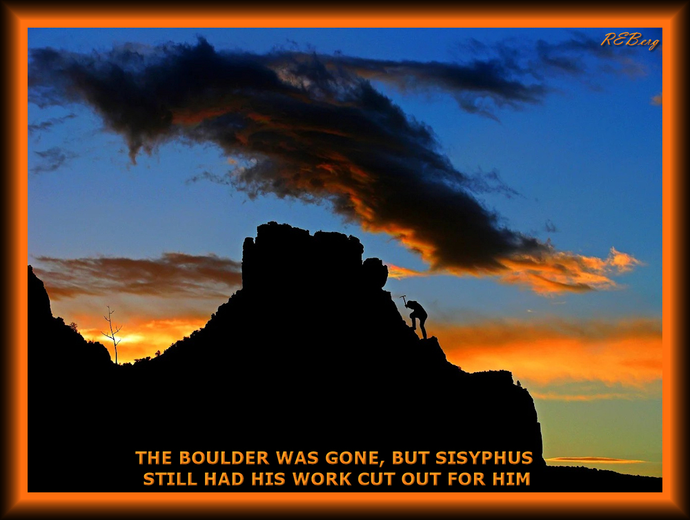 Just Another Sunny Day In Hades April 3, 2026 R.E. Berg humor, Imaginary Reality, joke, Locational Logic, meme, Mental Gymnastics, Occupational Oddities, Random Observations boulder, cut out, for him, gone, mountain, myth, push, silhouette, Sisyphus, still, sun, work