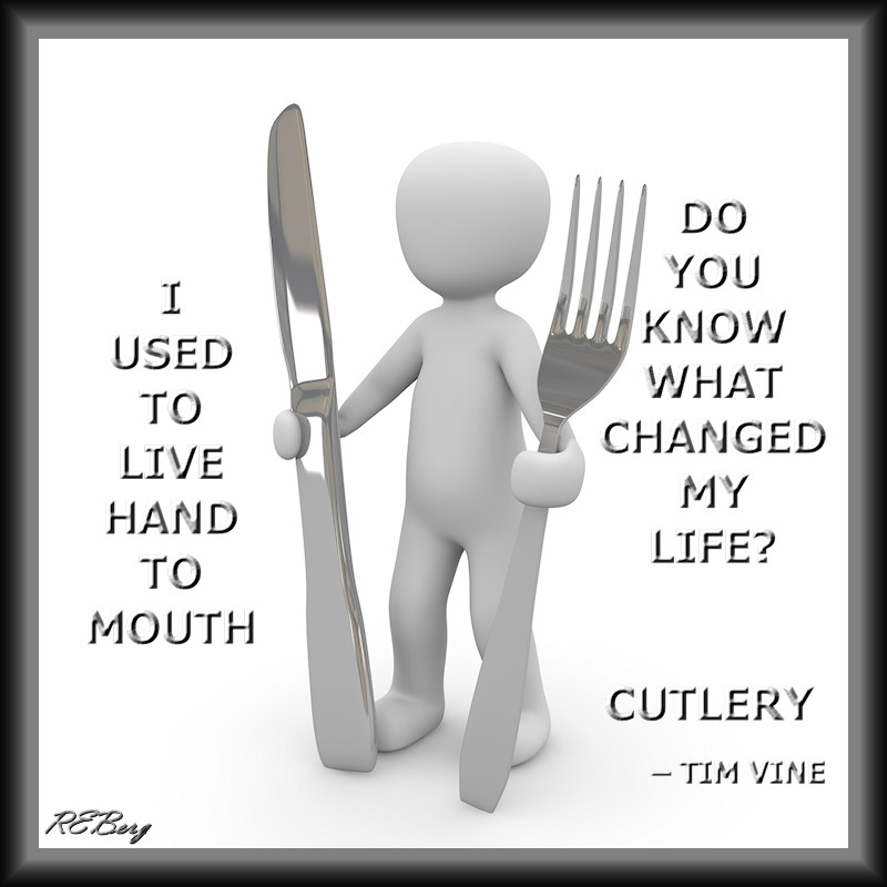 Prehensile Utensils Image March 19, 2023 R.E. Berg Culinary Curiosities, humor, joke, meme, Punishingly Punny Too, Quote Quotient changed, cutlery, dining, eating, food, fork, hand, knife, life, mouth, spoon, Tim Vine, used, what