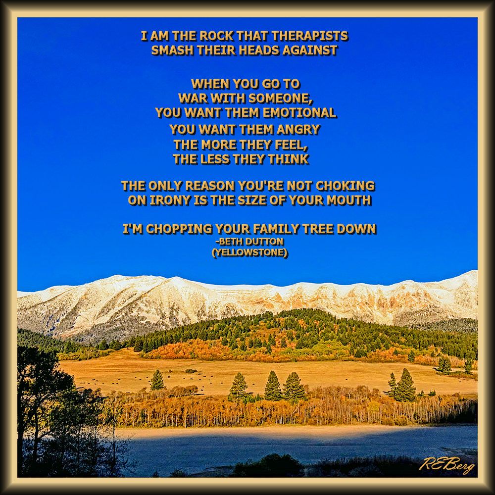 Bething The Ranch Image July 4, 2023 R.E. Berg humor, joke, Marginal Entertainment, meme, Quote Quotient, Social Hostility angry, Beth Dutton, choking, chopping, down, emotional, family, feel, heads, irony, mouth, reason, rock, size, smashing, therapists, think, tree, war, Yellowstone