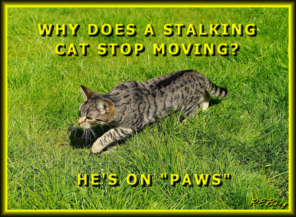 Motionless Explanation Image December 26, 2023 R.E. Berg Companion Critters, humor, joke, meme, Punishingly Punny cat, moving, pause, paws, stalking, stop
