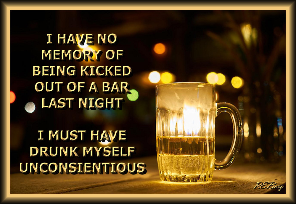 Immemorable Night Image November 12, 2023 R.E. Berg Culinary Curiosities, humor, Ill Legalities, joke, meme, Punishingly Punny bar, drunk, kicked, memory, night, unconscious, unconsientious