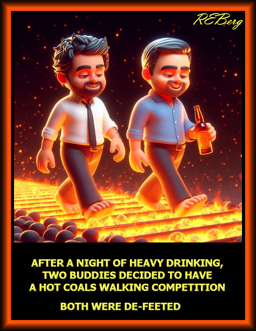 Feeling No Pain Image June 1, 2024 R.E. Berg humor, joke, Marginal Entertainment, meme, Punishingly Punny buddies, competition, de-feeted, decided, defeated, drinking, heavy, hot coals, night, walking