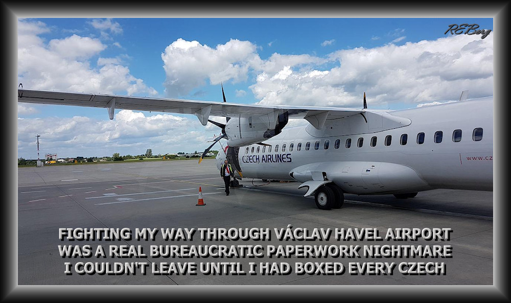 Pugilistic Passage Image October 17, 2023 R.E. Berg humor, joke, meme, Punishingly Punny Too, Travel Trauma box, boxed, bureaucratic, checked, Czech, every, fighting, leave, nightmare, paperwork, real, Vaclac Havel Airport