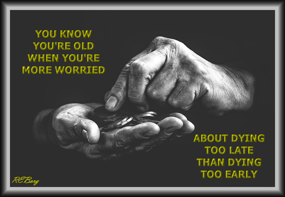 Time Is Money Image December 27, 2023December 27, 2023 R.E. Berg Age Management, Fanciful Finances, humor, joke, Lively Dying, meme, Random Observations coins, dying, early, hands, know, late, more, old, worried