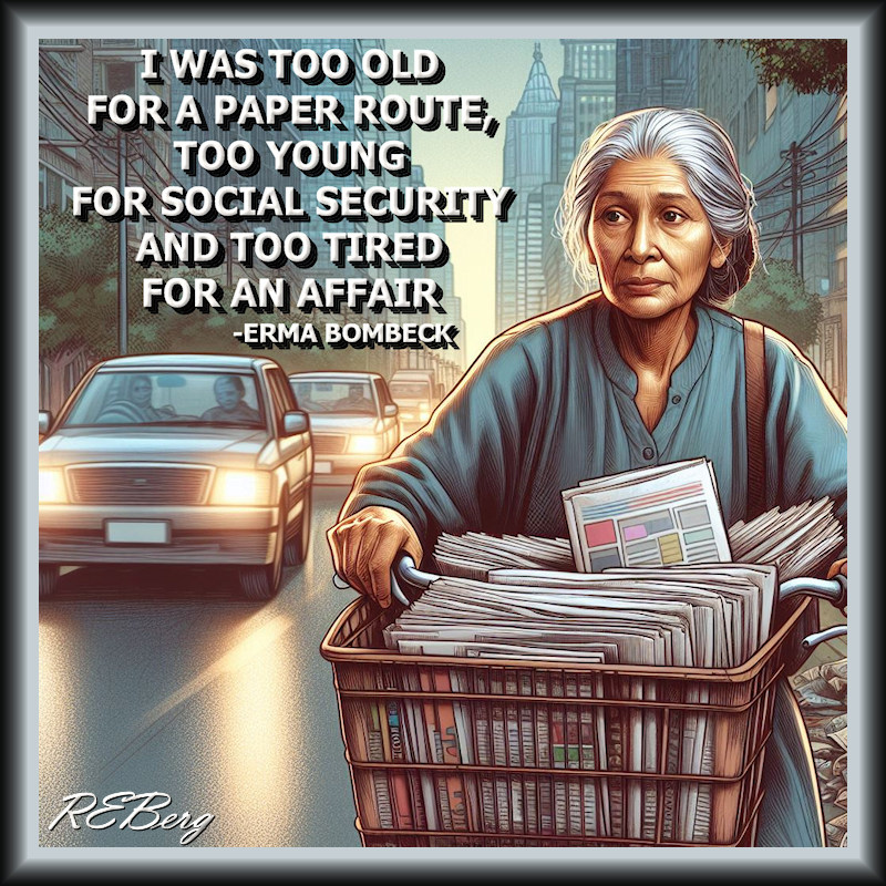 Out Of Options Image April 29, 2024 R.E. Berg Age Management, humor, joke, meme, Occupational Oddities, Quote Quotient, Rocky Relationships affair, Erma Bombeck, old, paper, route, Social Security, tired, young