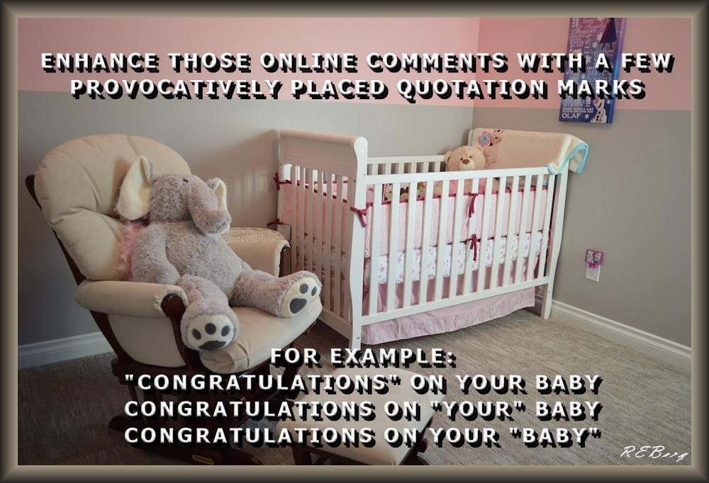 Punctuational Nuance Image March 9, 2023 R.E. Berg humor, joke, meme, Mental Gymnastics, Quote Quotient, Social Hostility baby, comments, congratulations, enhancement, examples, manipulation, marks, meaning, online, quotation