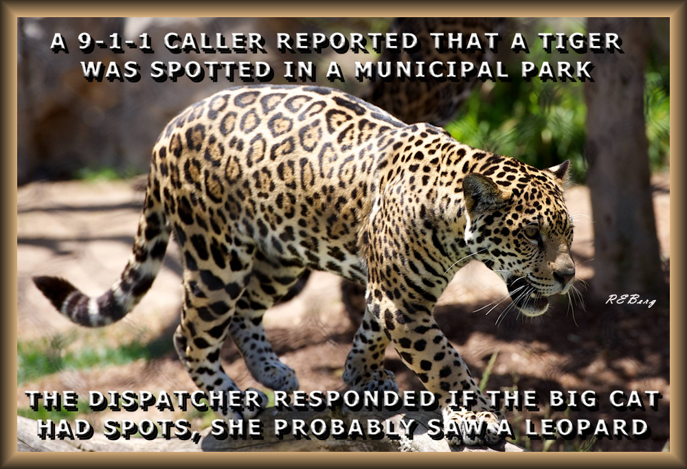 Mismarked Image January 13, 2023 R.E. Berg humor, joke, meme, Punishingly Punny, Random Observations 9-1-1, cat, dispatcher, leopard, municipal, park, spotted, stripes, tiger