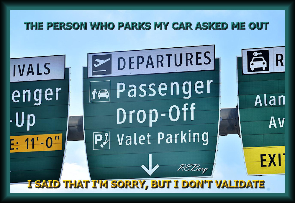 Let’s Just Be Friends Image July 16, 2023July 16, 2023 R.E. Berg humor, joke, meme, Punishingly Punny, Rocky Relationships, Social Hostility, Travel Trauma date, parking, valet, valid, validate