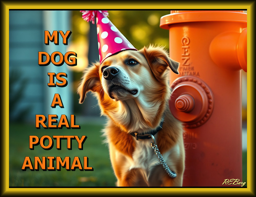Party On! Image February 28, 2025 R.E. Berg Companion Critters, humor, joke, Marginal Entertainment, meme, Punishingly Punny Too animal, dog, fire hydrant, hat, party, potty