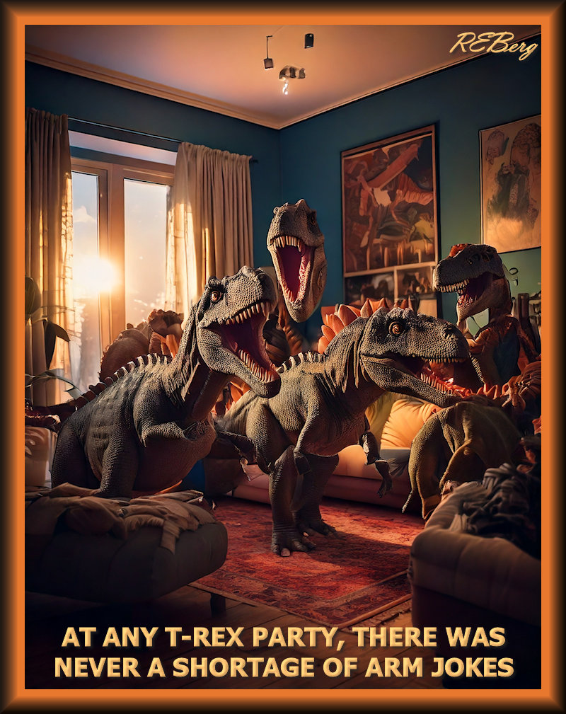 Reaching Out Image July 26, 2025 R.E. Berg Companion Critters, humor, Imaginary Reality, joke, Marginal Entertainment, meme, Punishingly Punny Too, Random Observations, Scientific Sensibility arm jokes, never a shortage, party, T-Rex