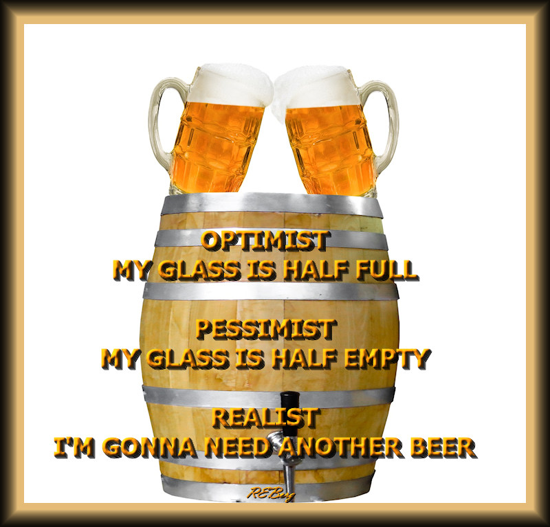 On The Level Image March 21, 2023 R.E. Berg Culinary Curiosities, humor, joke, meme, Mental Gymnastics, Random Observations another, barrel, beer, empty, full, glass, half, keg, need, optimist, pessimist, realist, refillable!, stein