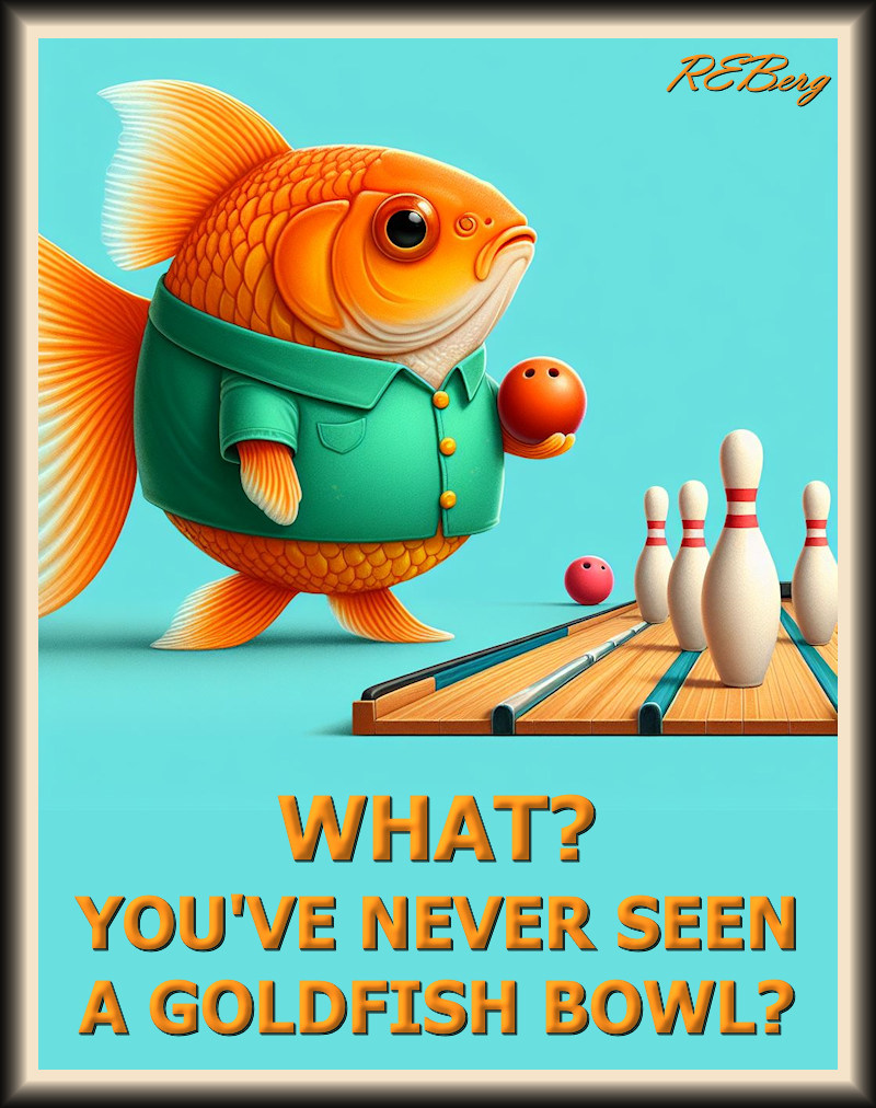 Well, Bowl Me Over Image March 27, 2024 R.E. Berg Companion Critters, humor, Imaginary Reality, Irrational Recreation, joke, meme, Punishingly Punny Too alley, bowl, bowling ball, goldfish, pins, seen