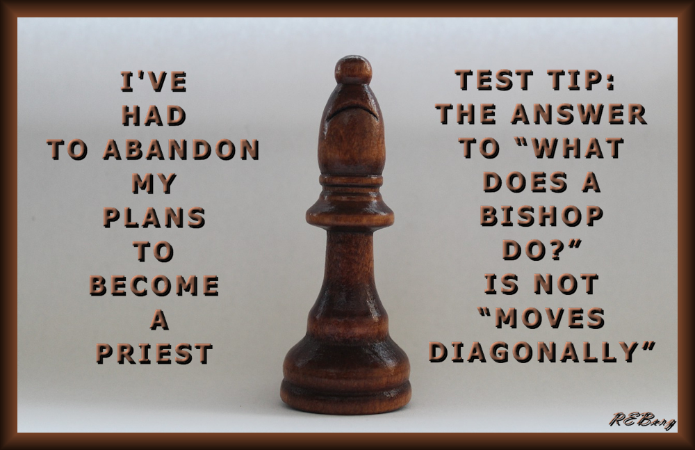 Wrong Slant Image May 31, 2023 R.E. Berg humor, joke, meme, Occupational Oddities, Punishingly Punny Too bishop, chess, diagonal, duties, failure, moves, plans, priesthood, test