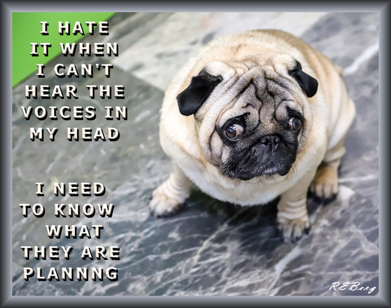 Suspicious Solitude Image August 3, 2023 R.E. Berg Companion Critters, humor, joke, meme, Mental Gymnastics dog, head, need-to-know, plans, Pug, silent, voices, worrisome