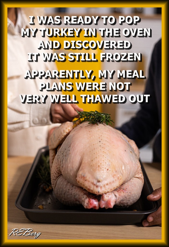 Going Cold Turkey Image August 12, 2023 R.E. Berg Culinary Curiosities, humor, joke, meme, Punishingly Punny discovered, frozen, meal, oven, plans, pop, ready, thawed out, thought out, turkey