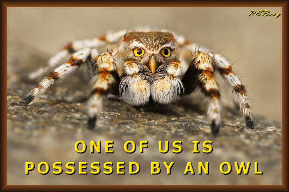 Who’s Hoo? Image May 29, 2023 R.E. Berg humor, Imaginary Reality, joke, meme, Mental Gymnastics answer, owl, possession, question, spider, who, yours
