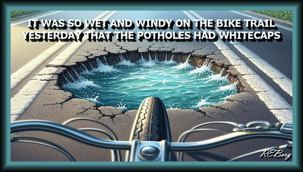 Image June 6, 2024June 6, 2024 R.E. Berg Deadly Living, humor, Irrational Recreation, joke, Lively Dying, Marginal Entertainment, meme bicycle, bike, potholes, ride, trail, waves, wet, whitecaps, windy