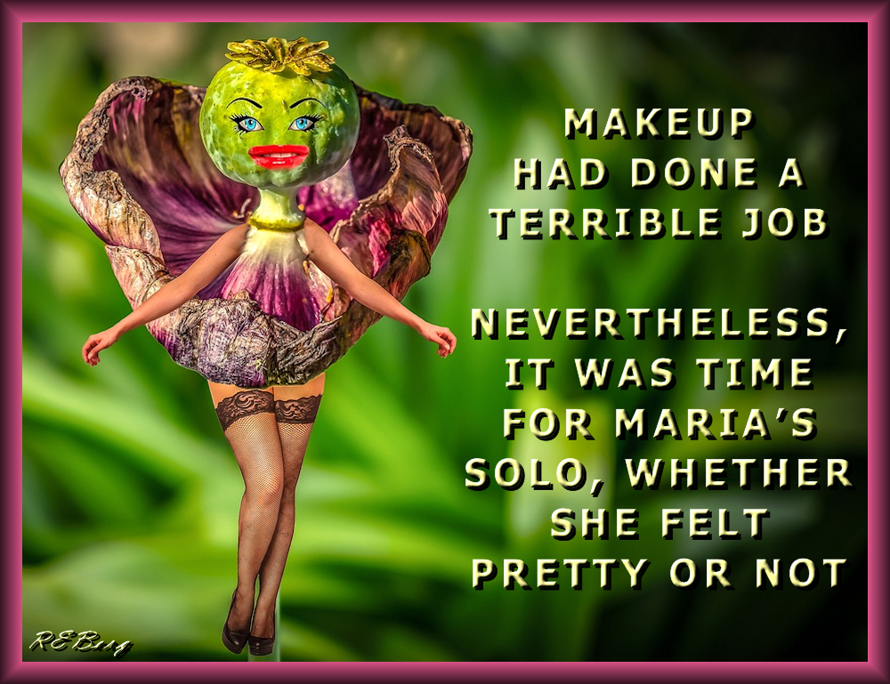 The Show Must Go On Image August 7, 2023 R.E. Berg humor, joke, Marginal Entertainment, meme, Occupational Oddities makeup, Maria, pretty, solo, West Side Story