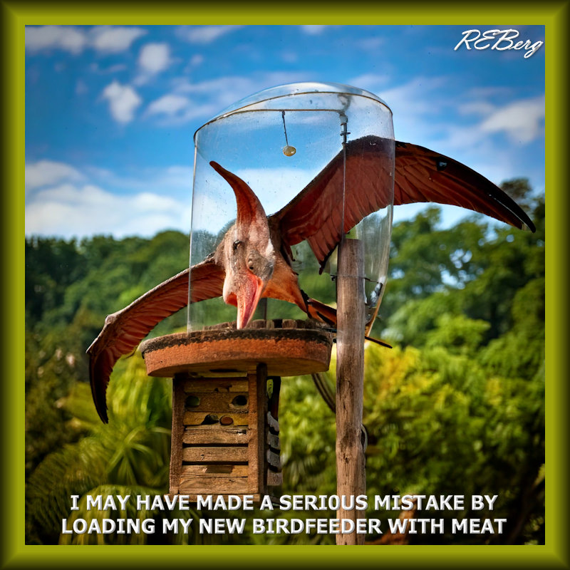 Problematic Protein Image March 13, 2025 R.E. Berg Companion Critters, Culinary Curiosities, Deadly Living, humor, Imaginary Reality, joke, Marginal Entertainment, meme, Random Observations birdfeeder, loading meat, pterodactyl, serious mistake