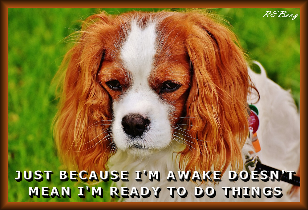 Active Misconception Image June 2, 2023 R.E. Berg Companion Critters, Fantasy Fitness, humor, Irrational Recreation, joke, meme, Social Hostility awake, do things, dog, ready