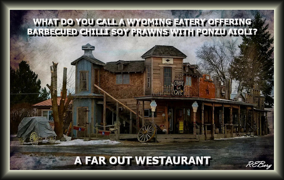 Unexpected Entree Image January 2, 2024 R.E. Berg Culinary Curiosities, humor, joke, meme, Punishingly Punny Too aioli, barbecued, chili, eatery, far out, ponzu, prawns, restaurant, soy, westaurant, Wyoming