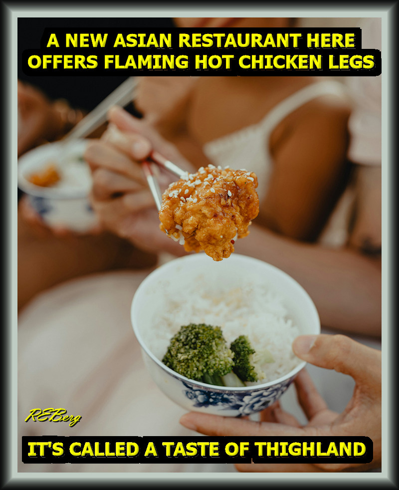 Adventurous Eatery Image February 9, 2024 R.E. Berg Culinary Curiosities, Deadly Living, humor, joke, meme, Punishingly Punny Asian, called, chicken, flaming, hot, legs, new, offers, restaurant, taste, Thailand, thighland