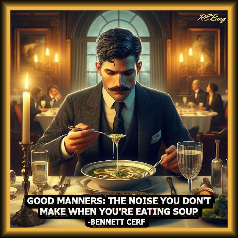 No Slurp, No Burp Image February 11, 2025 R.E. Berg Culinary Curiosities, humor, joke, meme, Quote Quotient, Random Observations, Social Hostility Bennett Cerf, dining, dinner party, eating soup, make, man, noise, restaurant