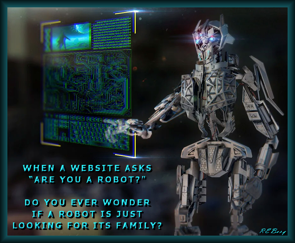 Who’s Asking? Image August 29, 2023 R.E. Berg humor, Imaginary Reality, joke, meme, Random Observations family, lonely, question, robot, website, wonder