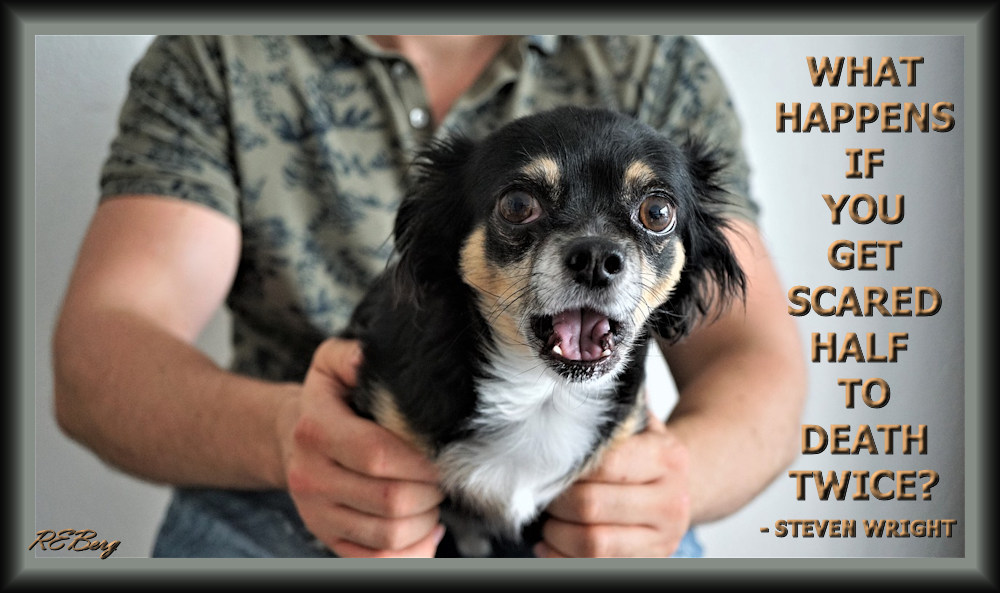 Half-Life Math Image March 21, 2023 R.E. Berg Companion Critters, Deadly Living, humor, joke, meme, Methodic Mathematics, Quote Quotient half to death, scared, Steven Wright, twice, what happens