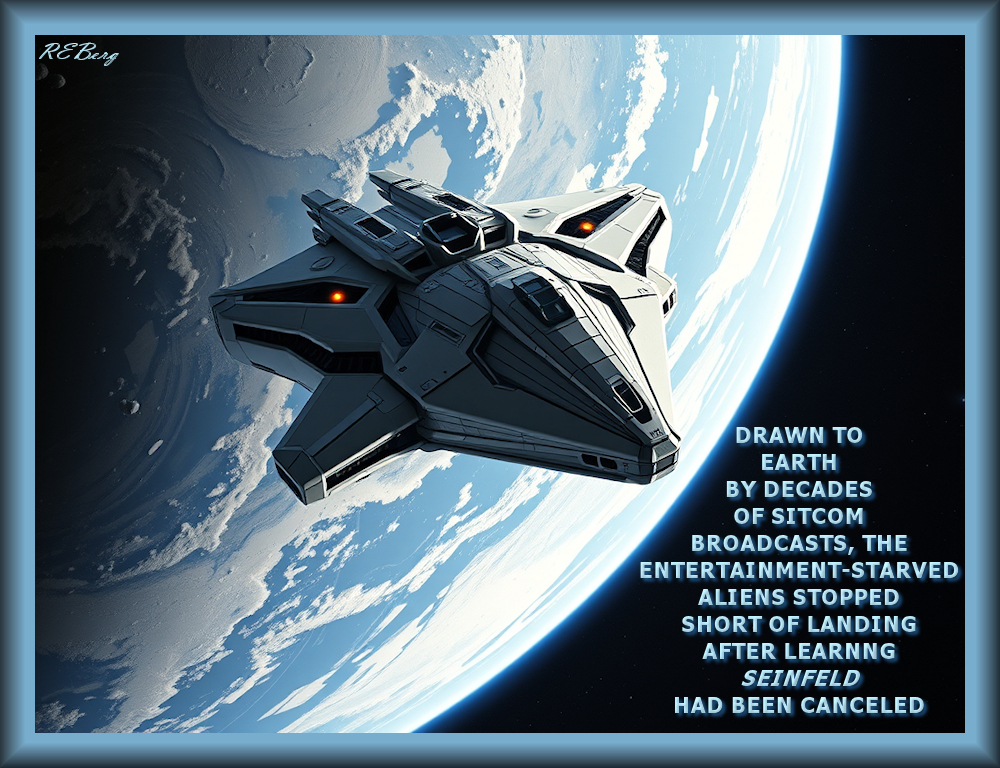 after learning, aliens, canceled, decades, drawn, Earth, entertainment-starved, Seinfeld, short of landing, sitcom broadcasts, spacecraft, stopped