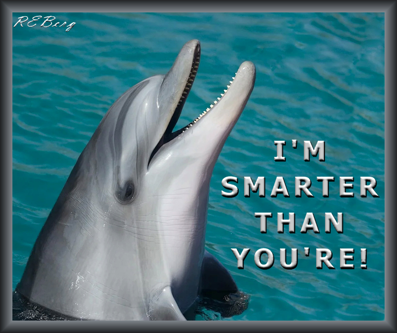 Yore IQ Image July 15, 2023 R.E. Berg Companion Critters, humor, joke, meme, Mental Gymnastics, Punishingly Punny Too dolphin, smarter, you are, you're, your
