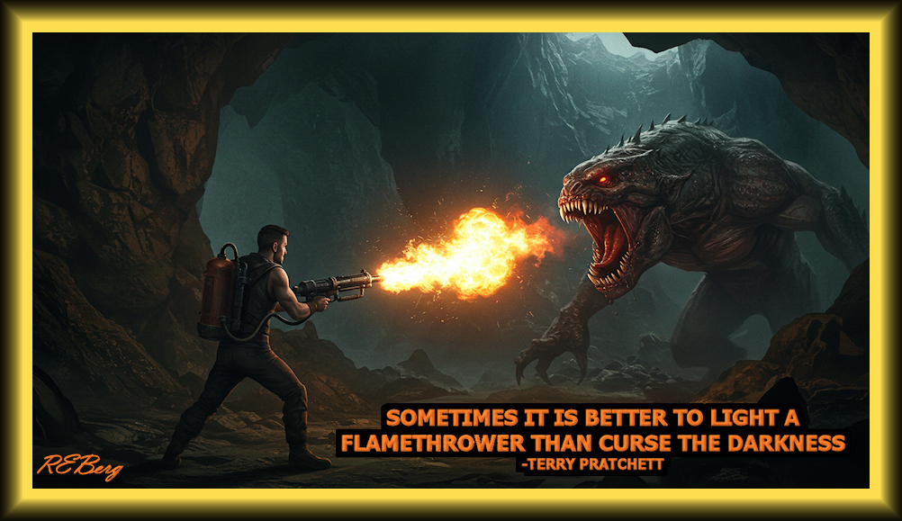 Light ‘Em Up! Image April 15, 2025 R.E. Berg Deadly Living, humor, joke, Lively Dying, meme, Quote Quotient, Random Observations better, curse, darkness, flamethrower, light, monster, sometimes, Terry Pratchett