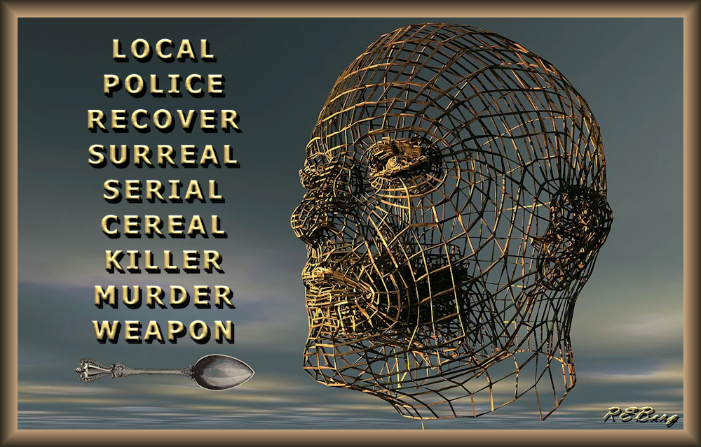 Crime Case Update Image January 26, 2023 R.E. Berg humor, joke, meme, Punishingly Punny cereal, killer, murder, serial, spoon, surreal, weapon