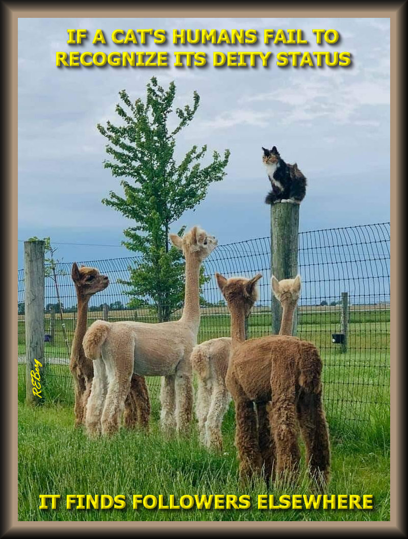Sermon On The Post Image September 20, 2025 R.E. Berg Companion Critters, humor, Imaginary Reality, joke, Marginal Entertainment, meme, Mental Gymnastics, Random Observations cat, deity, elsewhere, fail, finds, followers, Humans, llamas, recognize, status