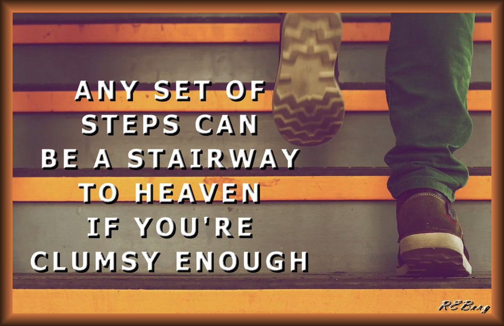 Stepping Up Image May 13, 2023 R.E. Berg humor, Imaginary Reality, joke, meme, Random Observations clumsy, heaven, stairway, steps