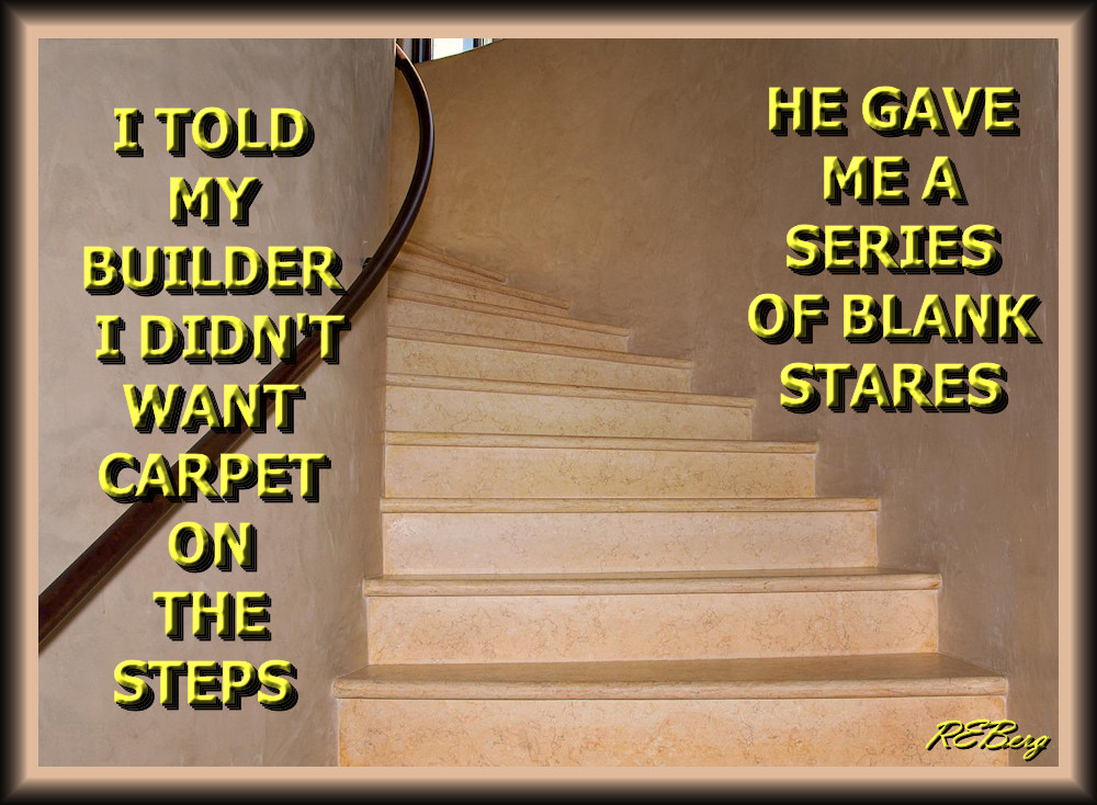 As You Wish Image May 15, 2023 R.E. Berg humor, joke, meme, Punishingly Punny blank, builder, carpet, series, stares, steps