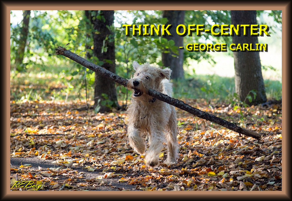 Whatever Gets The Job Done Image September 12, 2023 R.E. Berg Companion Critters, humor, joke, meme, Mental Gymnastics, Quote Quotient dog, fetch, George Carlin, off-center, stick, think