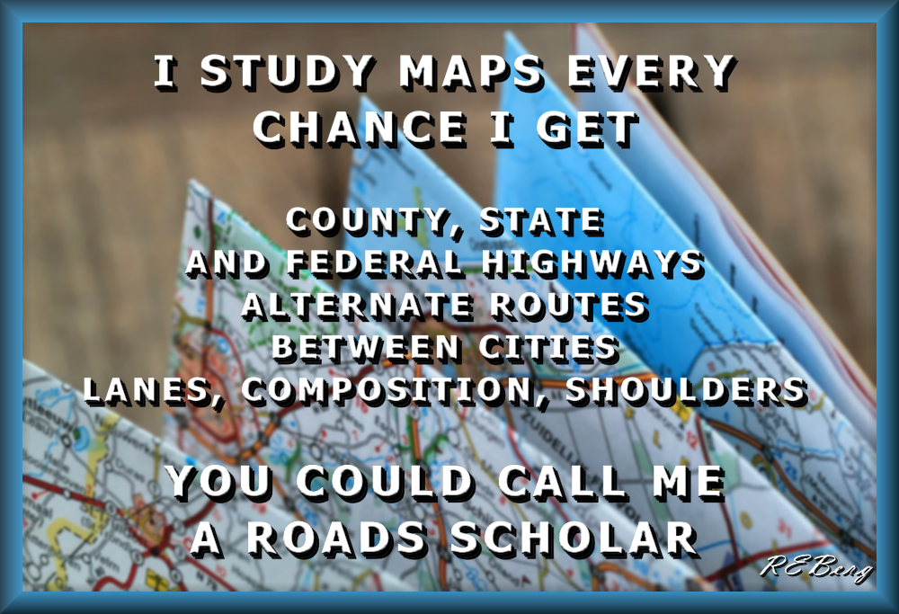 Erudite Roadmaster Image November 12, 2023 R.E. Berg humor, joke, meme, Punishingly Punny, Ready Reading, Travel Trauma cities, composition, highways, lanes, maps, Rhodes, roads, routes, scholar, shoulders, study