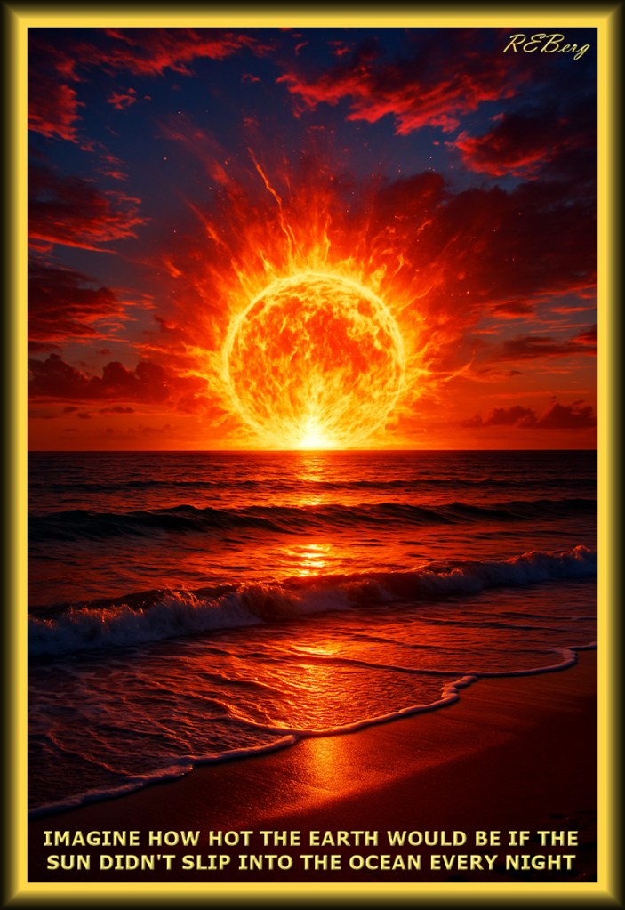 Quenching February 2, 2026February 2, 2026 R.E. Berg humor, Imaginary Reality, joke, Locational Logic, Marginal Entertainment, meme, Mental Gymnastics, Random Observations bathe, cool off, didn't slip, Earth, every night, how hot, Imagine, into the ocean, sun, swim, would be