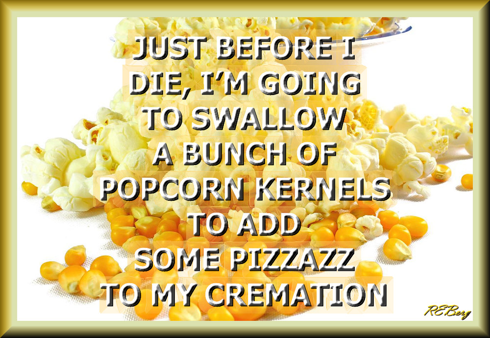 Better Bring Butter Image April 24, 2023 R.E. Berg Culinary Curiosities, humor, joke, Lively Dying, meme before, bunch, cremation, die, kernels, pizzazz, popcorn, swallow