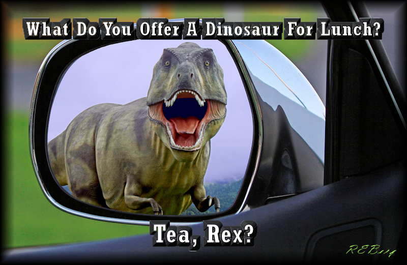 Beastly Beverage Image May 8, 2023 R.E. Berg Culinary Curiosities, humor, joke, meme, Punishingly Punny dinosaur, lunch, Rex, T-Rex, tea