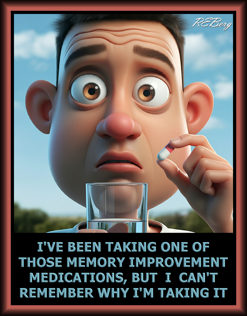 Memory Mobius Image January 27, 2025December 6, 2025 R.E. Berg Age Management, humor, Imaginary Reality, joke, meme, Mental Gymnastics, Random Observations, That's Living can't remember, man, medication, memory improvement, pill, puzzlement, taking, water glass, why taking