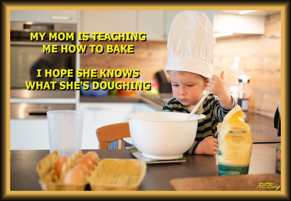Rising Star Image October 27, 2023 R.E. Berg Culinary Curiosities, humor, Improper Parenting, joke, meme, Punishingly Punny Too, Rocky Relationships baking, bowl, child, doing, doughing, hat, hope, knows, mom, stirring, teaching