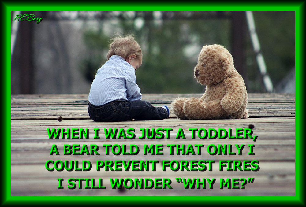 Heavy Burden Image June 1, 2023 R.E. Berg Companion Critters, humor, Imaginary Reality, joke, meme bear, forest fires, only, prevent, toddler, told, why me