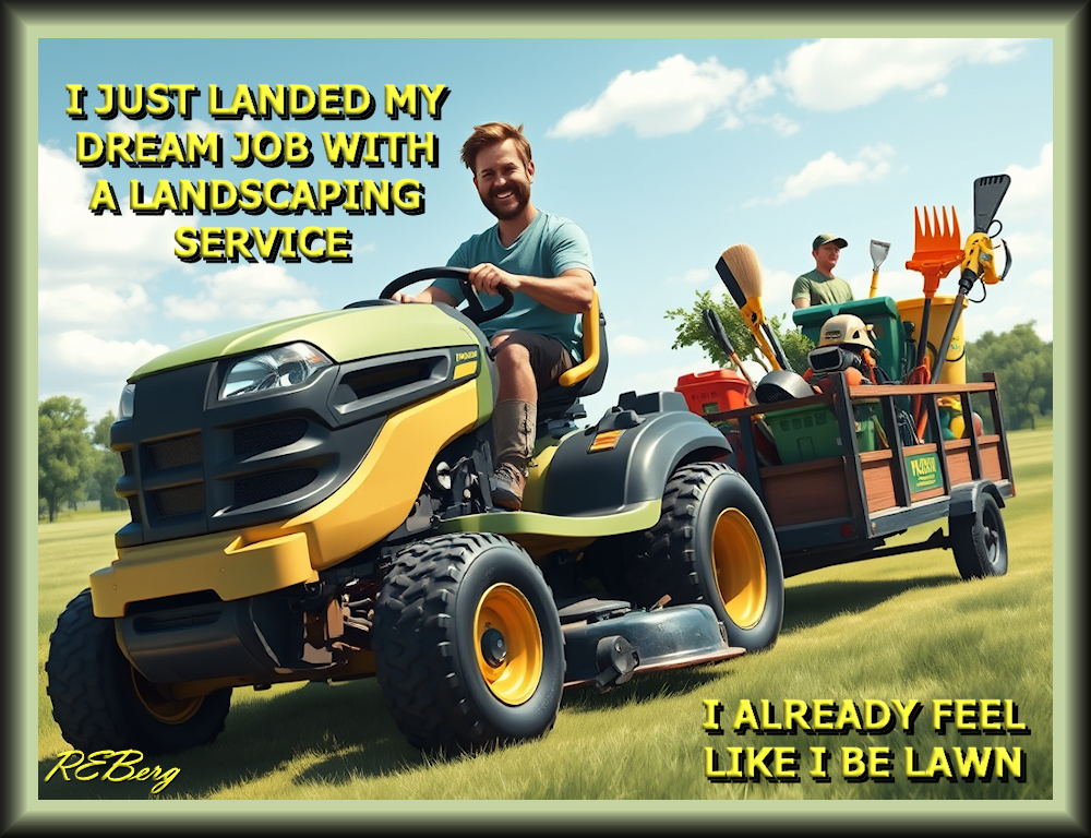 Lawn Ranger Image January 18, 2025January 18, 2025 R.E. Berg humor, joke, meme, Mental Gymnastics, Occupational Oddities, Punishingly Punny already feel, be lawn, belong, dream job, landed, landscaping service, man, tools, tractor, trailer