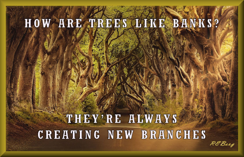 Banking On Growth Image April 5, 2023 R.E. Berg Fanciful Finances, humor, meme, Punishingly Punny banks, branches, creating, trees