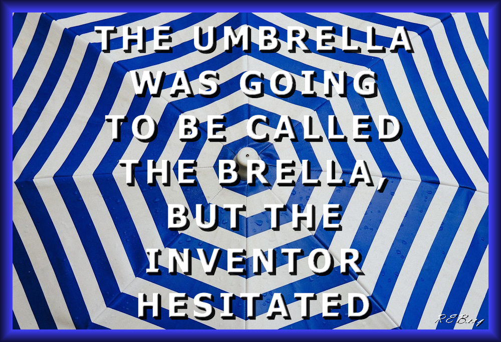 Bumbershoot Bumble Image October 9, 2023 R.E. Berg humor, joke, meme, Mental Gymnastics, Punishingly Punny brella, hesitated, inventor, um, umbrella